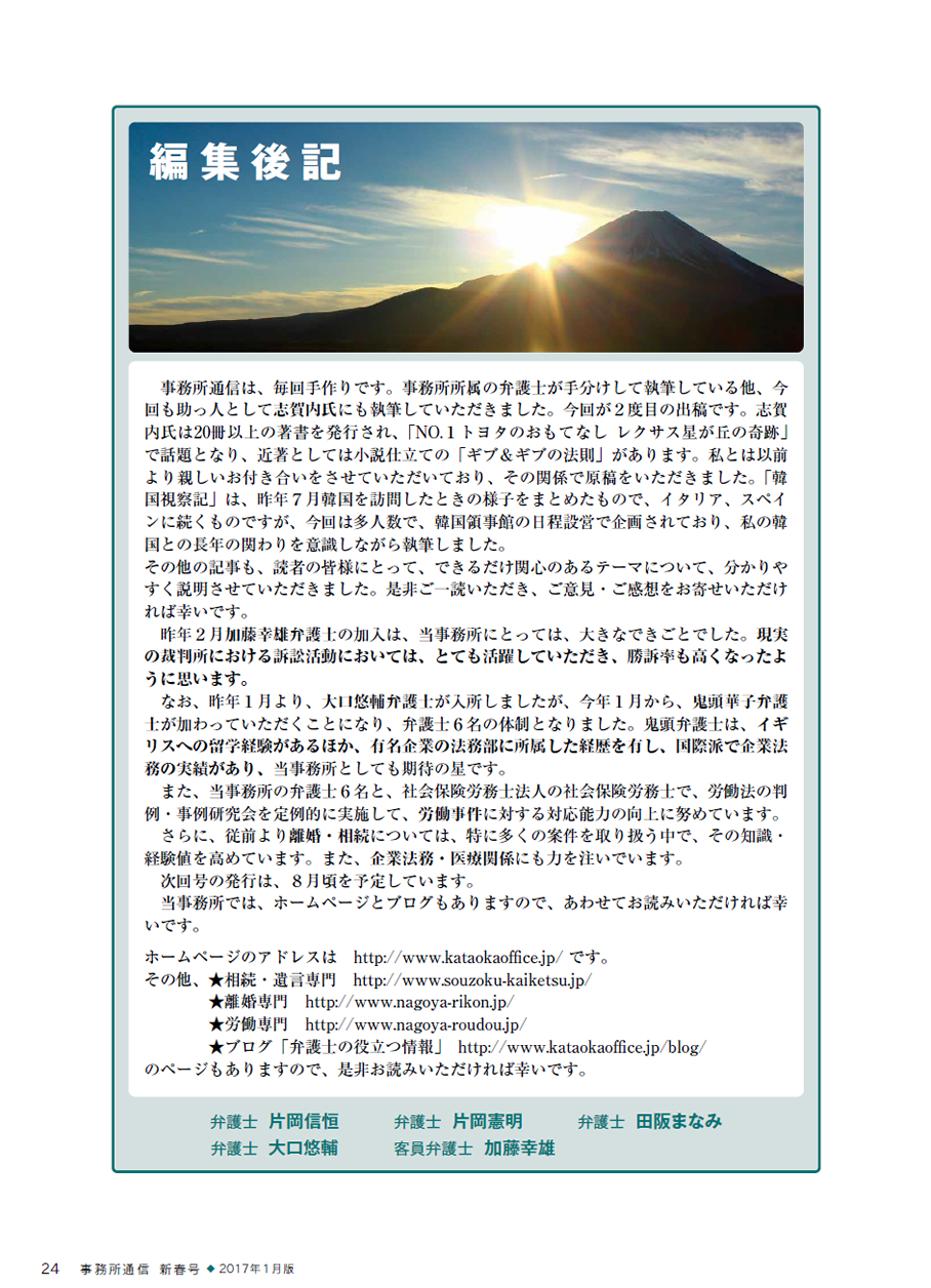 名古屋・大垣の弁護士事務所。離婚、相続・遺言、不当解雇、債務整理、契約書作成、刑事事件、取引紛争、渉外法務などの法律相談。