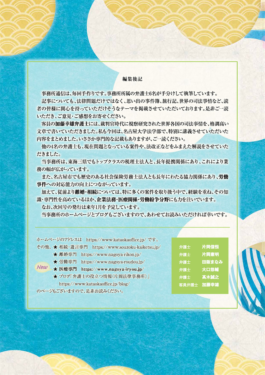 名古屋・大垣の弁護士事務所。離婚、相続・遺言、不当解雇、債務整理、契約書作成、刑事事件、取引紛争、渉外法務などの法律相談。